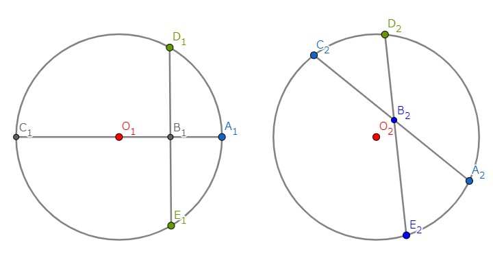 左図の場合、特に\(A_1C_1\)は直径であり\(D_1E_1\)と直交、したがって、\(D_1B_1 = B_1E_1\)となっている。